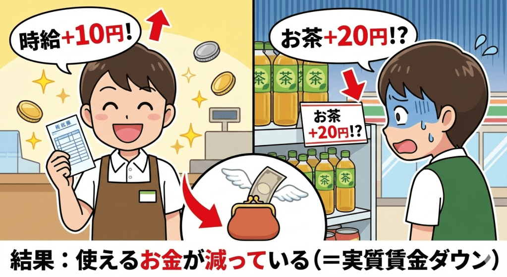時給は確かに増えているのに、実際にお茶を買おうとすると、